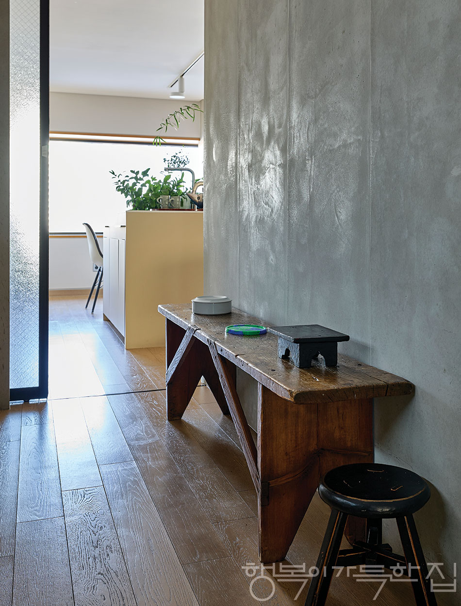 주방 한편에서는 미국 유학 시절부터 함께한 벤치가 정서적 중심을 잡아준다.