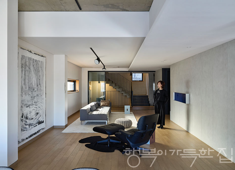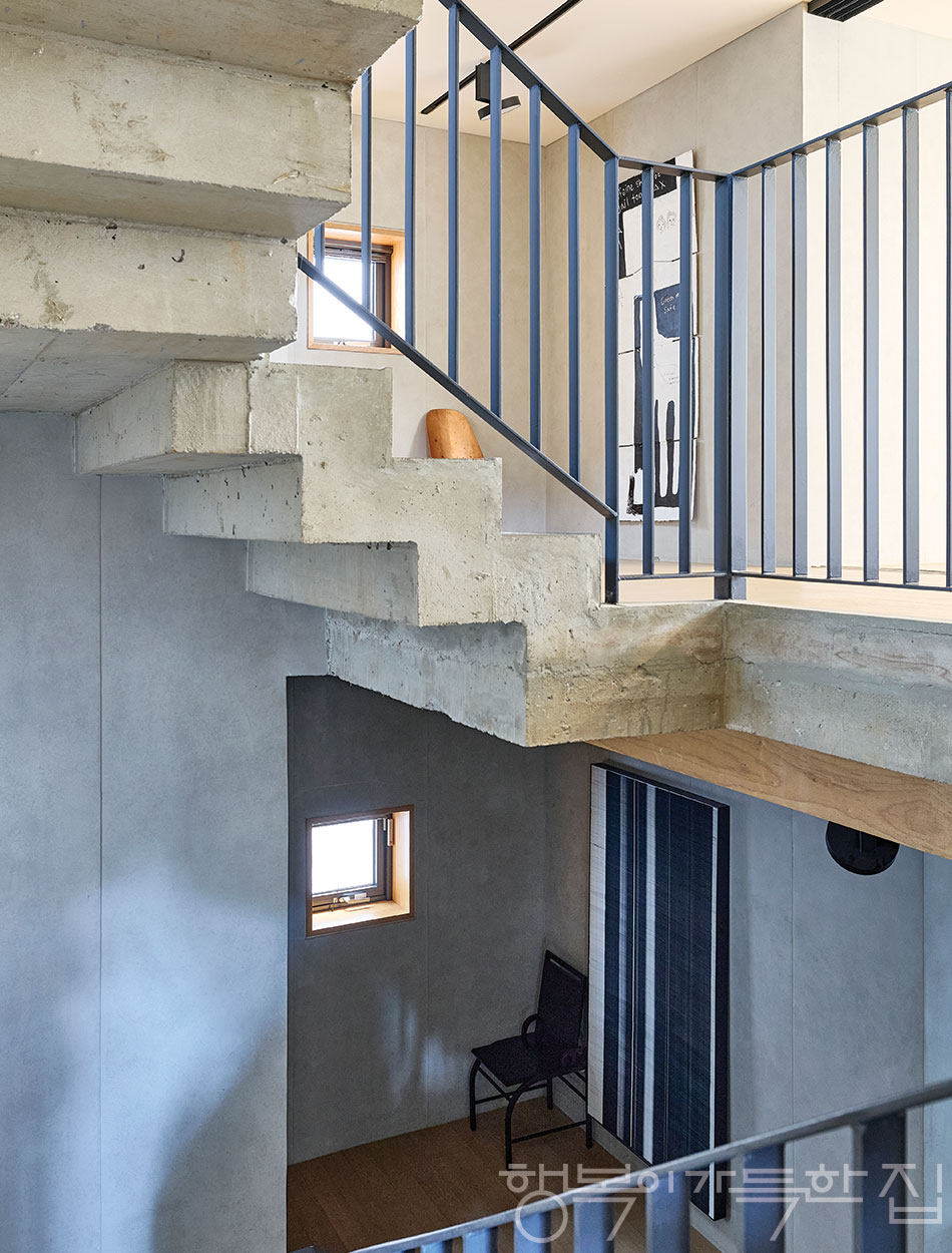 기둥과 벽면, 그리고 계단이 하나의 큰 조형성 아래 조화를 이룬 오미화 대표의 집. 그녀가 오랫동안 아끼고 사랑하던 로프트 하우스를 좌표로 삼았다.