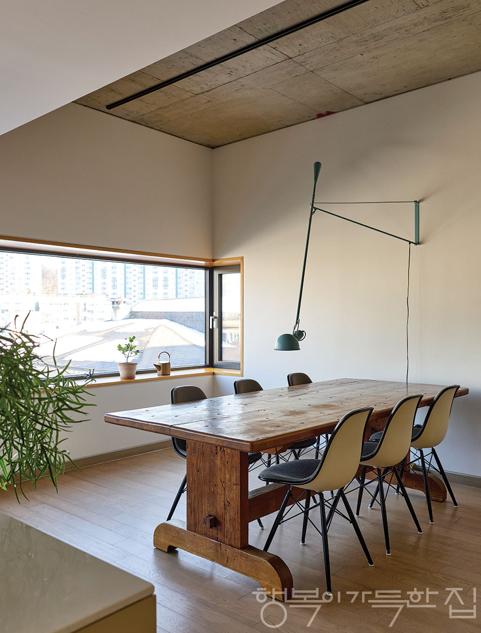 개인적으로 가장 마음에 드는 공간. 무심하고 단단한 디자인의 테이블과 빈티지 조명이 오미화 대표의 미감을 고스란히 드러낸다.