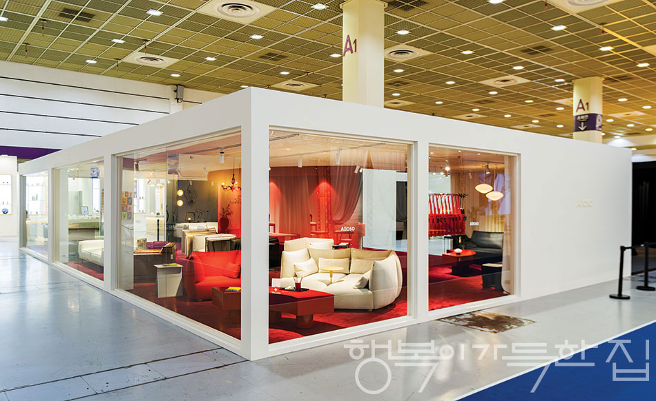 알로소는 관람객이 저마다의 집을 떠올려보길 바라는 마음으로 집을 콘셉트로 하는 브랜드관을 연출했다. 강렬한 레드 컬러 사이로 알로소의 1인 소파 사티를 배치했다.