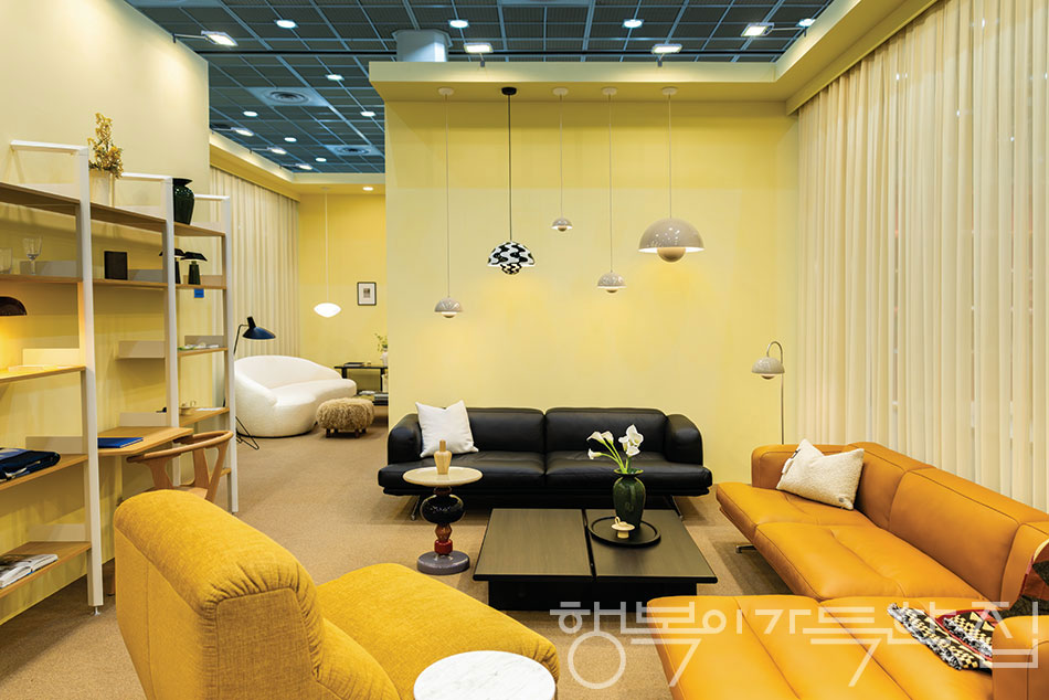 플라워팟 펜던트 조명과 인랜드 소파를 감각적으로 배치해 브랜드관을 자신들만의 리빙 장면으로 만들었다.