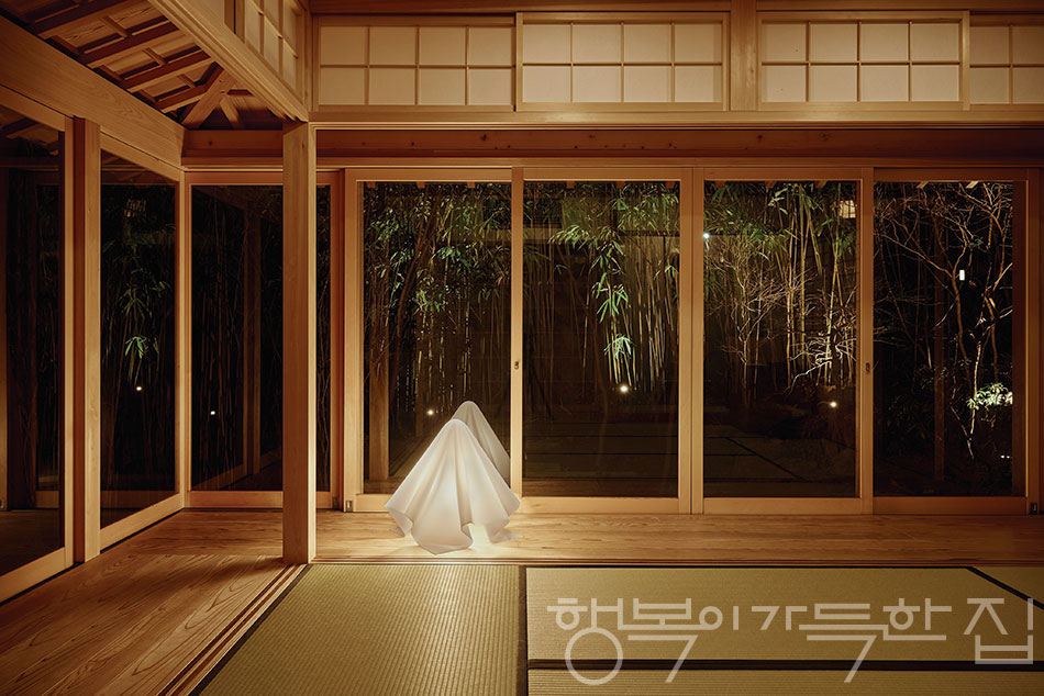 야마기와의 미학은 세기를 넘나드는 조명 명작들에서 실제 모습으로 드러난다. 이들의 컬렉션은 빛을 다루는 방식에 대한 각기 다른, 그러나 완벽한 해답이다. 가장 먼저 공간의 위계를 세우는 것은 건축 거장의 유산이다. ‘프랭크 로이드 라이트 탈리에신Frank Lloyd Wright Taliesin’ 컬렉션은 라이트의 건축 언어를 조명으로 정교하게 번역해낸 결과물이다. 나무 블록과 차양 사이로 기하학적으로 조각난 빛은 공간에 새로운 리듬과 질서를 부여한다. 마치 하나의 작은 건축물이 실내에 들어온 듯한 조형미는 빛과 그림자의 대비만으로 공간을 꽉 채우는 힘을 지녔다. 반면 프리츠커 수상자 이토 도요伊東豊雄의 ‘마유하나Mayuhana’는 빛의 밀도를 다루는 걸작이다. 유리섬유를 고치(cocoon)처럼 촘촘히 감아 만든 구球 형태는 빛을 은은하게 머금었다 뱉어낸다. 광원이 직접 보이지 않고 빛의 입자만 안개처럼 번지며, 공간의 심도를 한층 깊고 그윽하게 만든다.